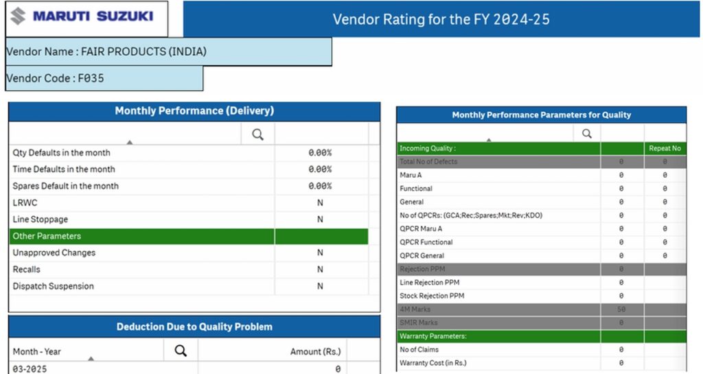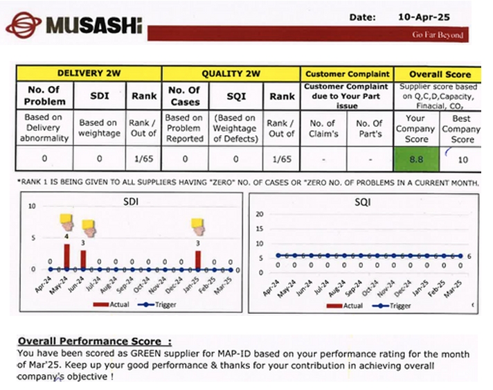 Fair Products India is proud to be rated as a top-performing vendor by industry leaders Maruti Suzuki and Musashi. These prestigious ratings reflect our unwavering commitment to quality, on-time delivery, and manufacturing excellence. Such recognition drives us to continually exceed expectations and strengthen our role as a trusted partner in the automotive supply chain, both in India and across global markets.